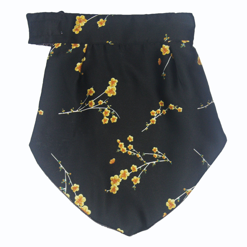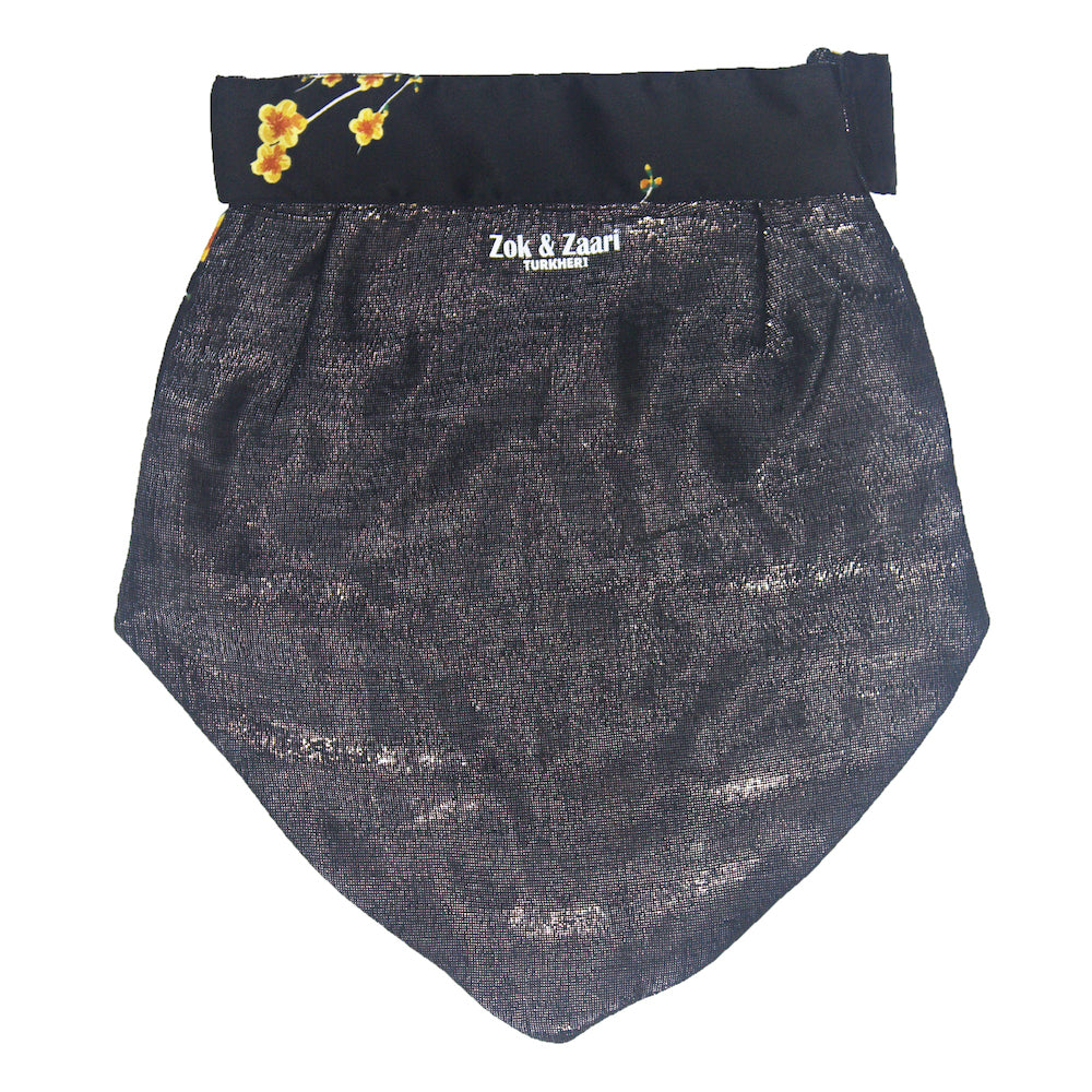 Color: Front solid black yellow flowers, back silver shimmer black